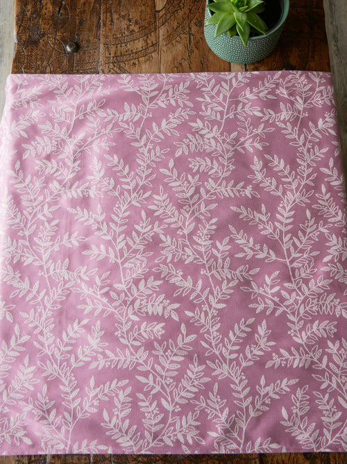 Multicolored scarf draped over a mannequin with a white backgroundFabric with a gradient pattern of trees and leaves on a wooden surface