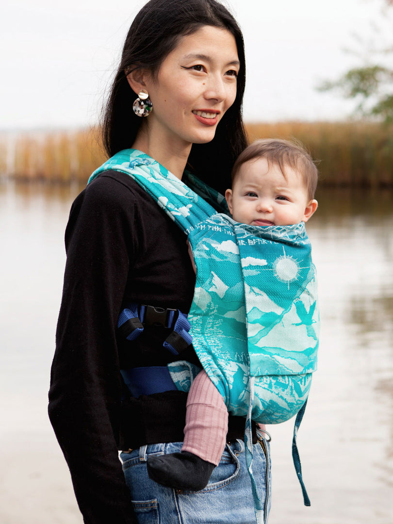 I found it easy to put on for front carries, as the wrap fabric moves and glides nicely into place around my child. The straps weren't too wide and were able to sit on the centre of my shoulders without riding up into my neck. Normally I prefer wrap straps on soft structured carriers to allow spread on my shoulders but these felt lovely and light and the grip of the wrap helped them to stay put. The padded part of the straps flared out early enough in their length so that I (a size 10-12) could spread them across my side and over baby's body. In back carries with a small toddler, the padded part of the shoulder wasn't too long; I was able to spread the fabric over the knee pits nicely. The half width straps are light and easy to manoeuvre, and the knot is quick and simple to make with no stiffness (this is partly due to the softness of the wrap used to make this tester, but all wraps will break in with use!).