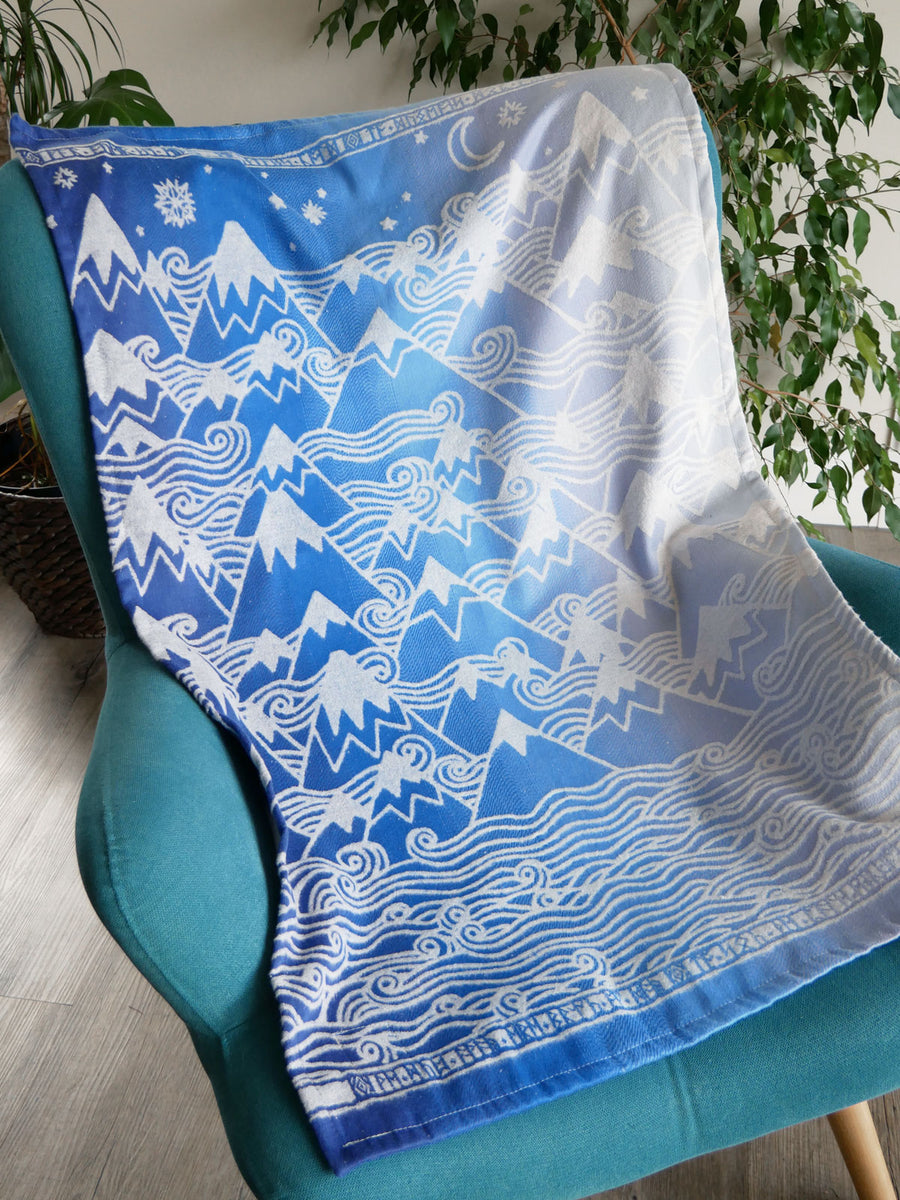 Oscha Slings ethically handcrafted Misty Mountains Aduial Lightweight Baby Blanket in Scotland, and it comes with a Peace Of Mind Guarantee.
