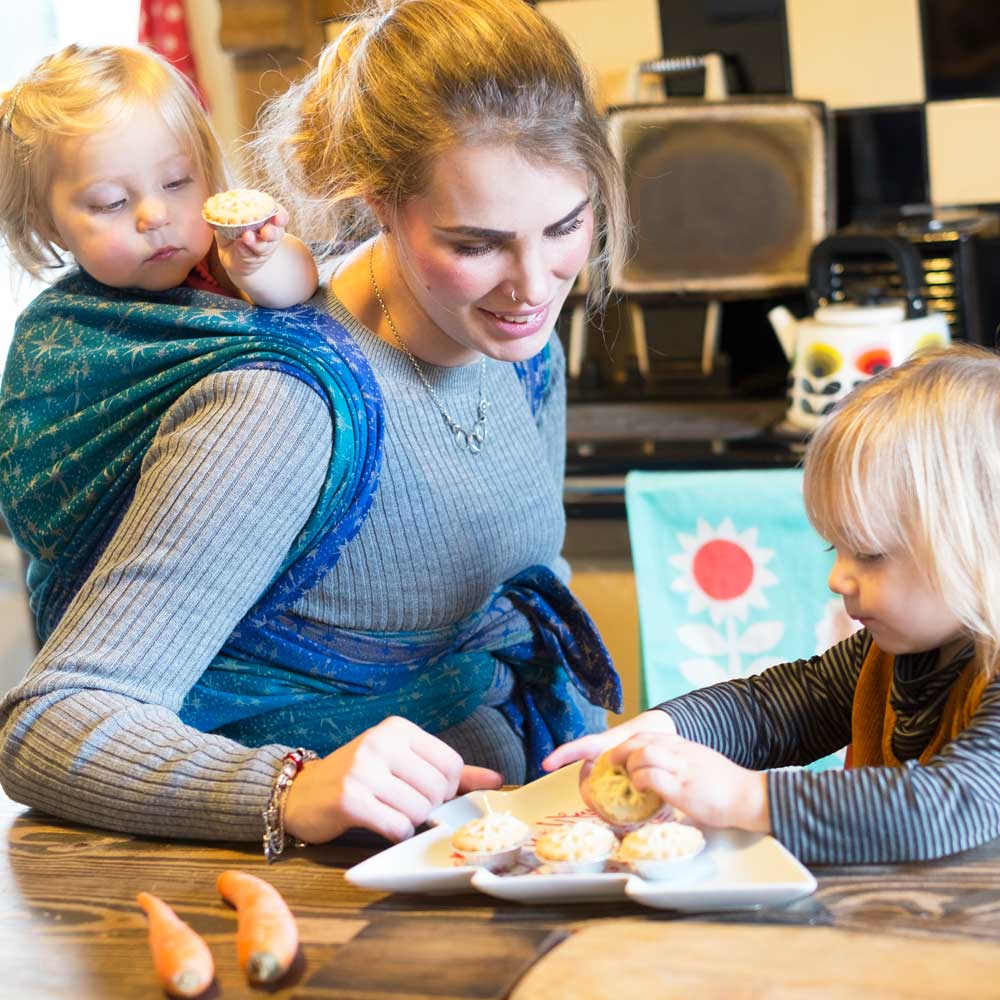 Tragehilfen wie die Poppins Hip Carry oder ein unter dem Po gebundener Ruck sind perfekt für unabhängige Kleinkinder, die gerne die Möglichkeit haben, müde Beine auszuruhen, es sich aber schnell anders überlegen!