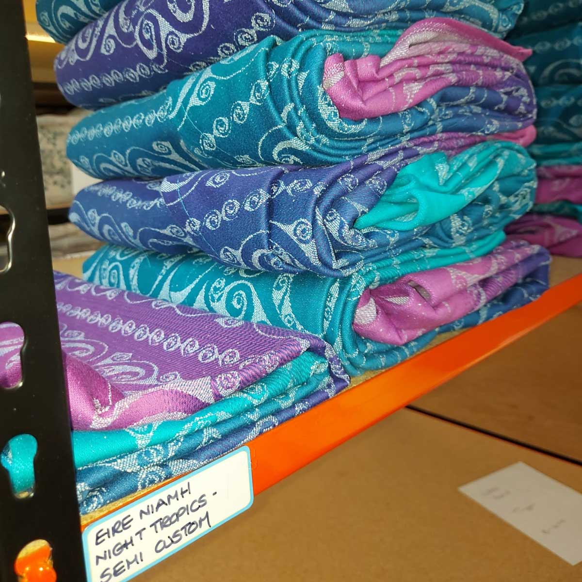 Diese sind auf ähnliche Weise organisiert, mit der Ausnahme, dass einer Gruppe ein Abschnitt einer Kette angeboten wird, die wir bereits weben, anstatt sie selbst von Grund auf zu entwerfen. Wir werden Gruppen kontaktieren, deren Warp-Ideen unseren ähneln. Für eine Halbanfertigung ist die Abstimmung einfacher, da es weniger Optionen gibt – weniger Schussgarne und 4 Muster. Bei semi-individuellen Gruppen müssen sich nur 300 Mitglieder bewerben, und die Bearbeitungszeit ist kürzer. Bestellungen werden innerhalb von 2 bis 4 Monaten nach Abschluss der Vorbestellung geliefert.