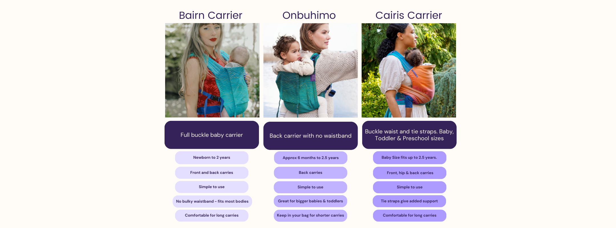 Sie finden den Cairis in 3 Größen – Baby, Kleinkind und Vorschule. Über unseren Made-to-Order-Service ist auch eine XL-Option mit längeren Trägern und einer längeren Taille erhältlich .