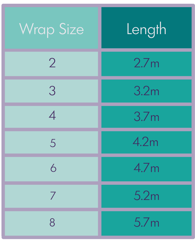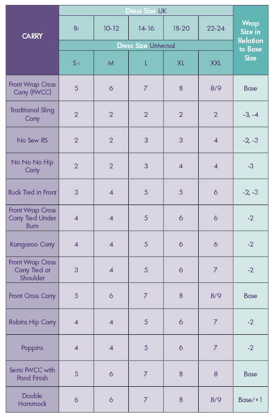 Wenn ja, wählen Sie Ihre „Basisgröße“ (siehe Tabelle) – dies ist die Größe, die für die in der Anleitung gezeigte Trageweise benötigt wird – Front Wrap Cross Carry (FWCC).