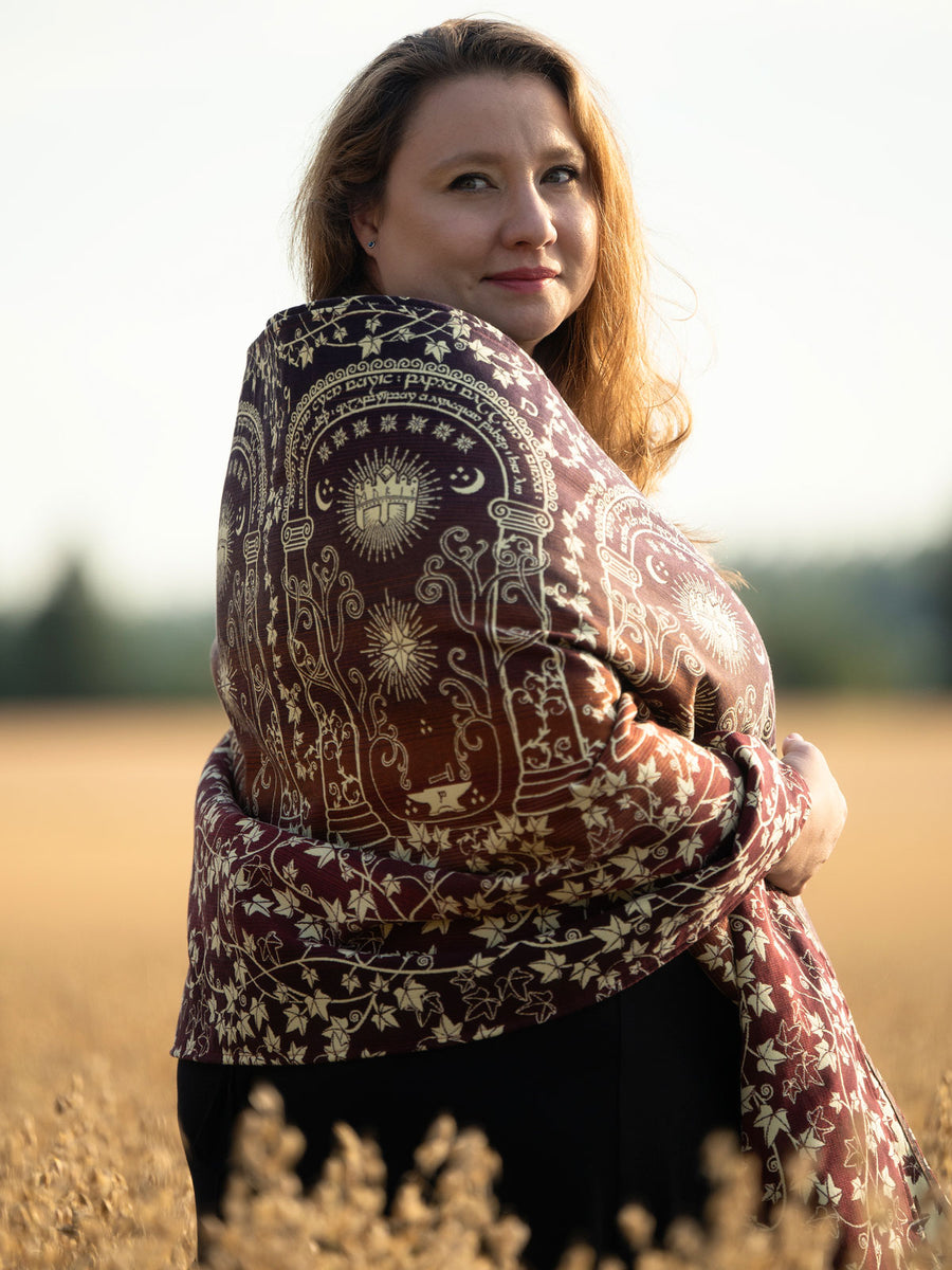 Inspiriert von den legendären „Türen von Durin“ wird das Design durch eine sorgfältig strukturierte, doppellagige Kette zum Leben erweckt. Eine Lage glänzt in bunten Herbsttönen, die zweite besteht aus ecrufarbener Bio-Baumwolle. Ein schwarzer Schussfaden verwebt sich mit der bunten Kette und dämpft die Farbtöne dezent, ohne das Design zu überschatten. Das Muster selbst wird zart durch goldgelbe Cashwool hervorgehoben, die vor dem dunkleren Hintergrund leuchtet.