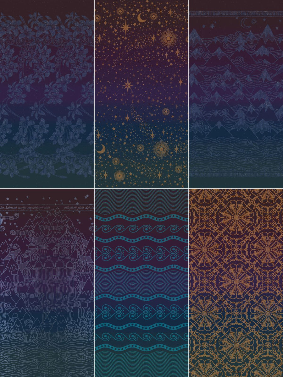 Diese Kollektion umfasst entweder 1,5 m, 1 m oder 0,5 m von jedem der acht Stoffe. Die Muster umfassen: